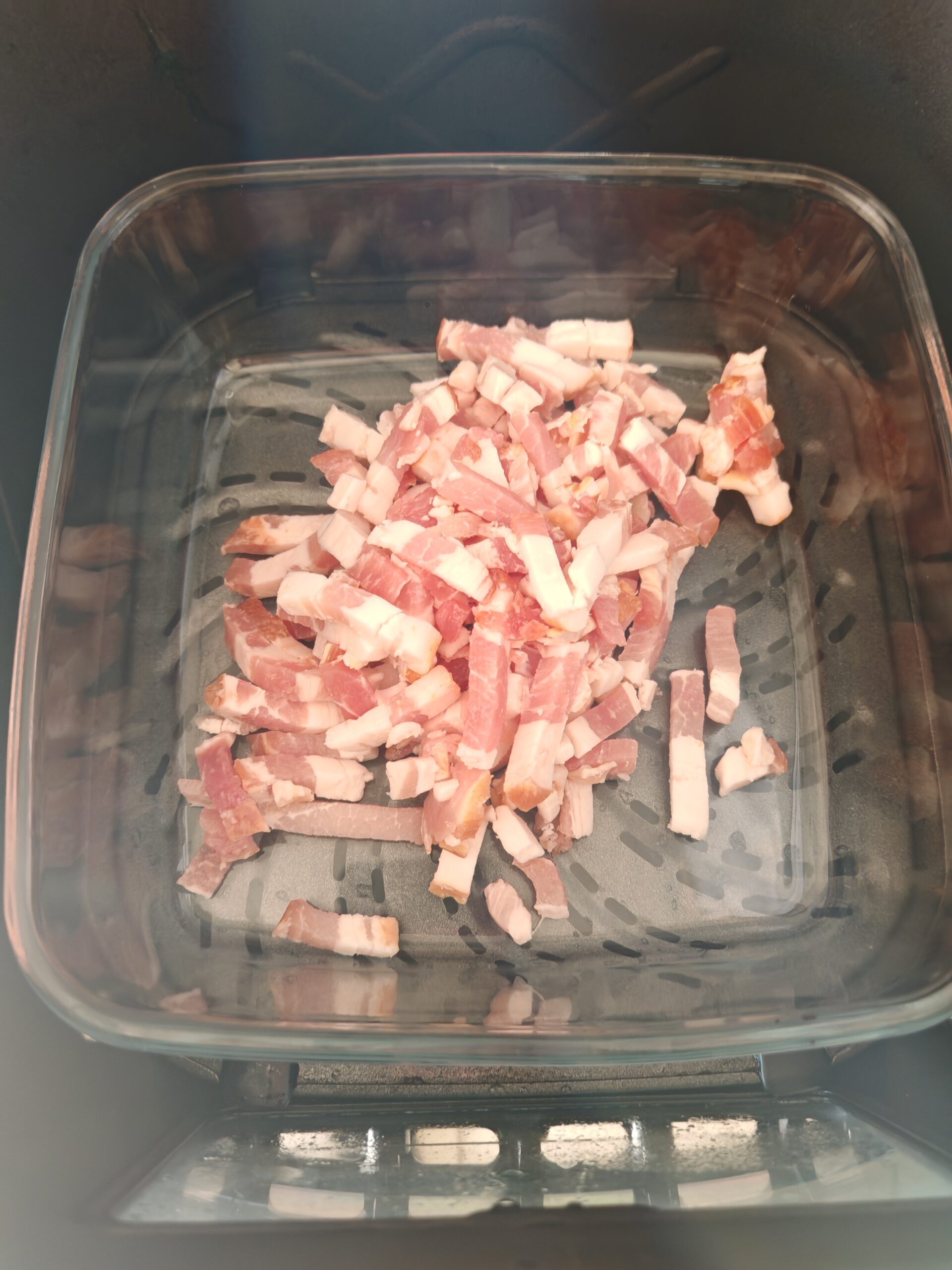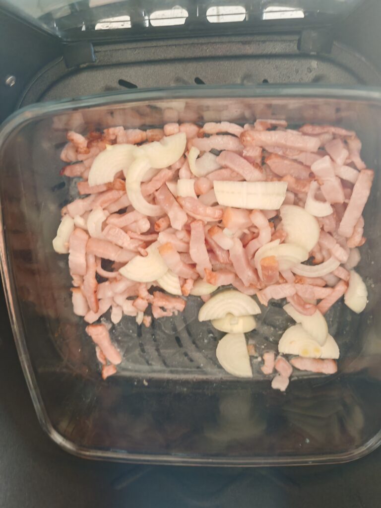 Do Air Fryer wkładamy boczek, ja używam żaroodpornego naczynia