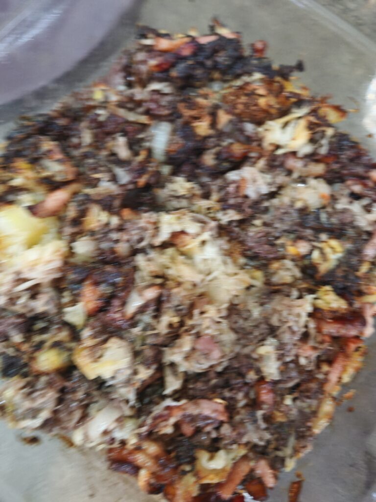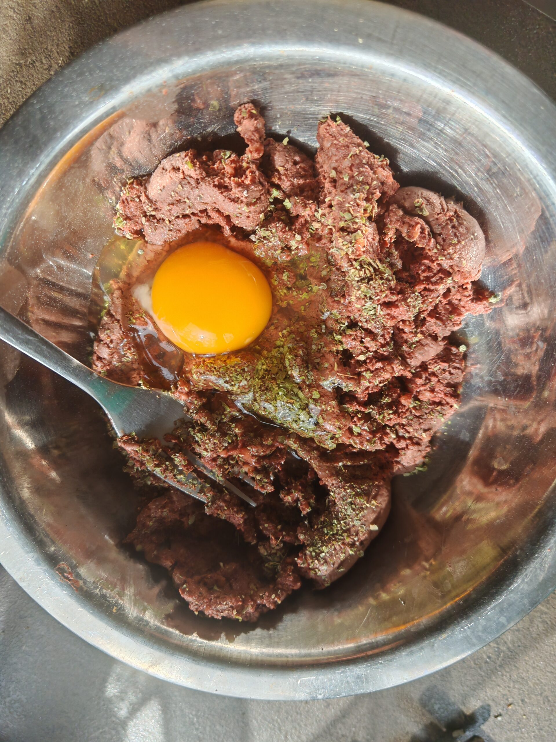 Dodajemy pieprz troszkę soli (boczek sam w sobie jest słony), majeranek, wbijamy jajko i mieszamy.